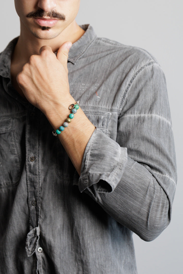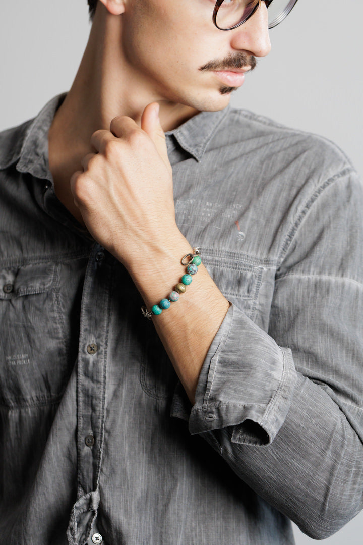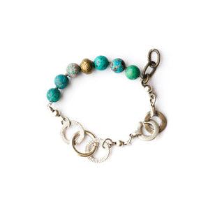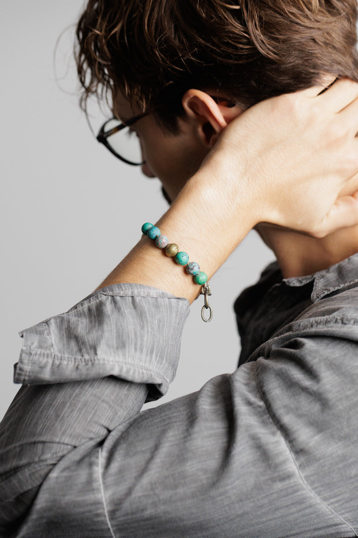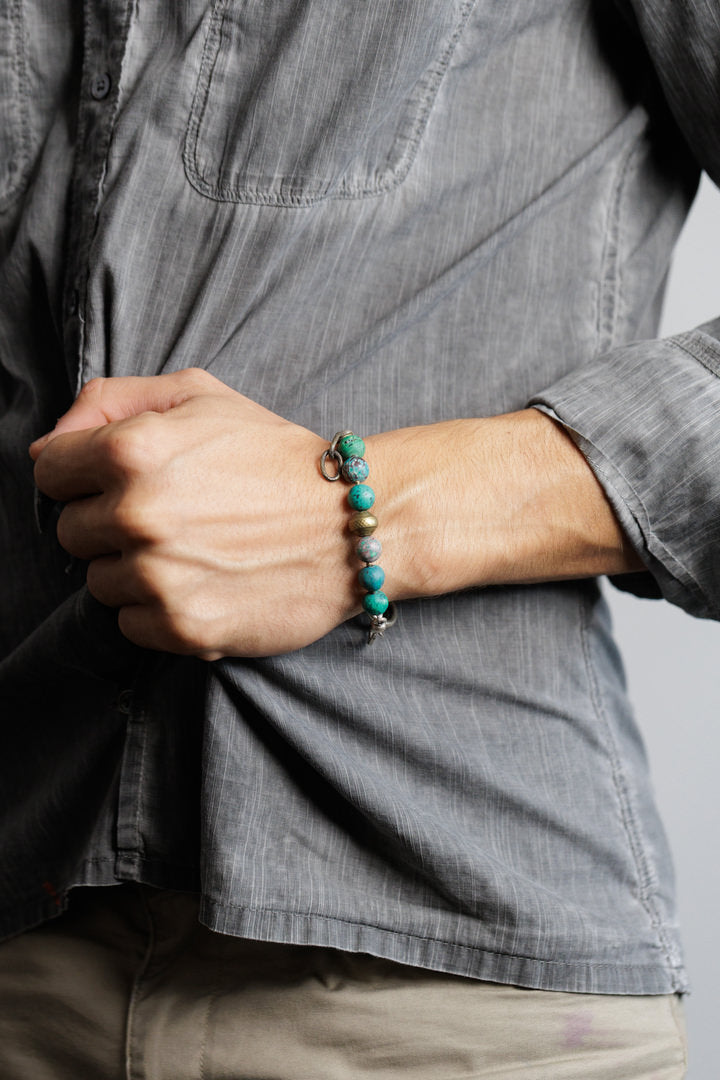 Narukvica od afričkog tirkiza i metalne legure s patinom i mesinga.
