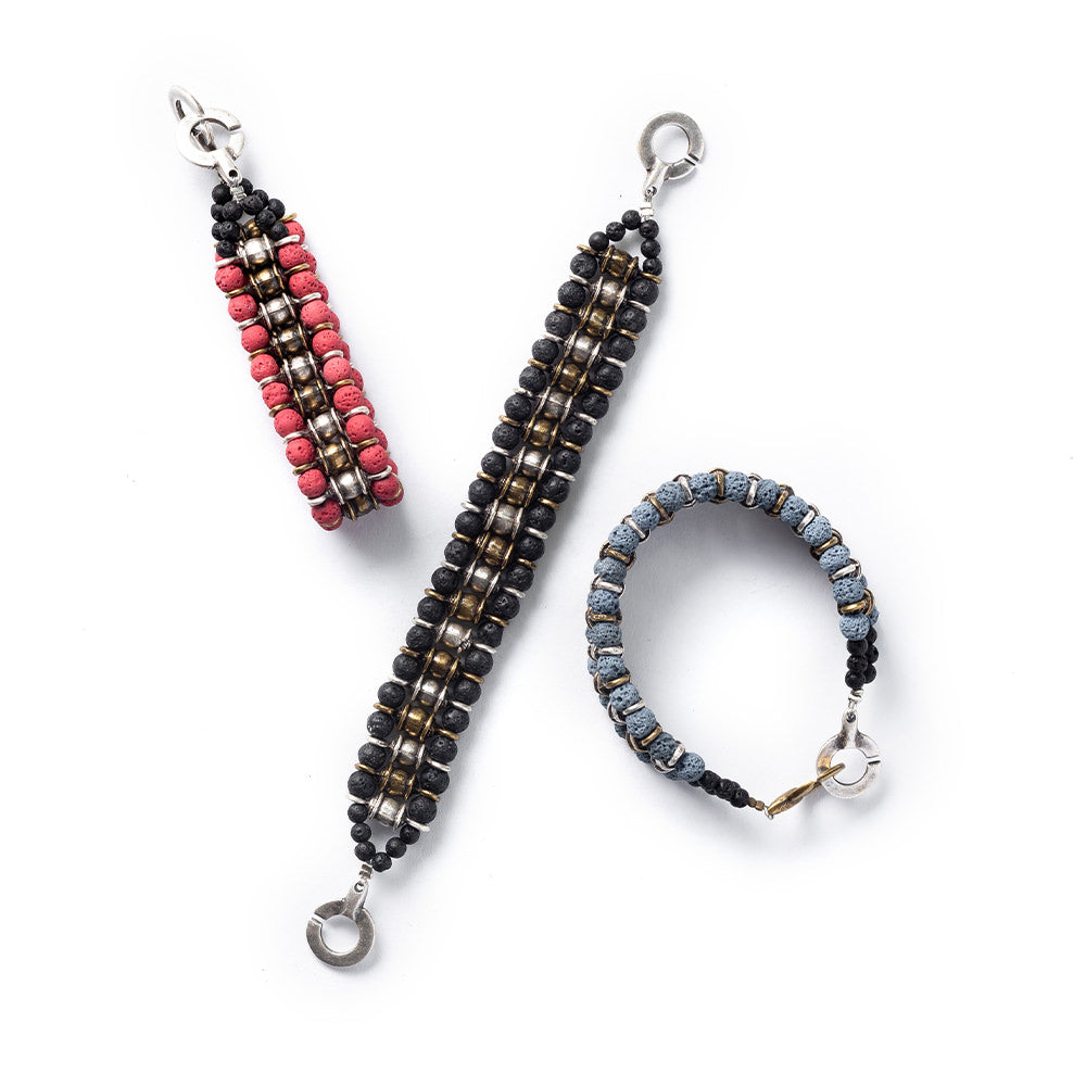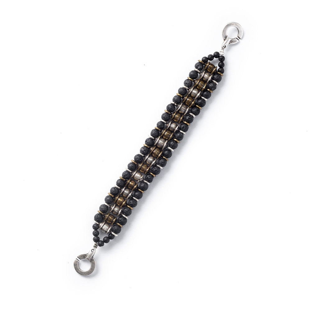 Narukvica od crnog vulkanskog kamena s elementima metalne legure s patinom.