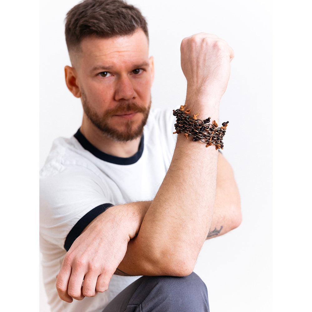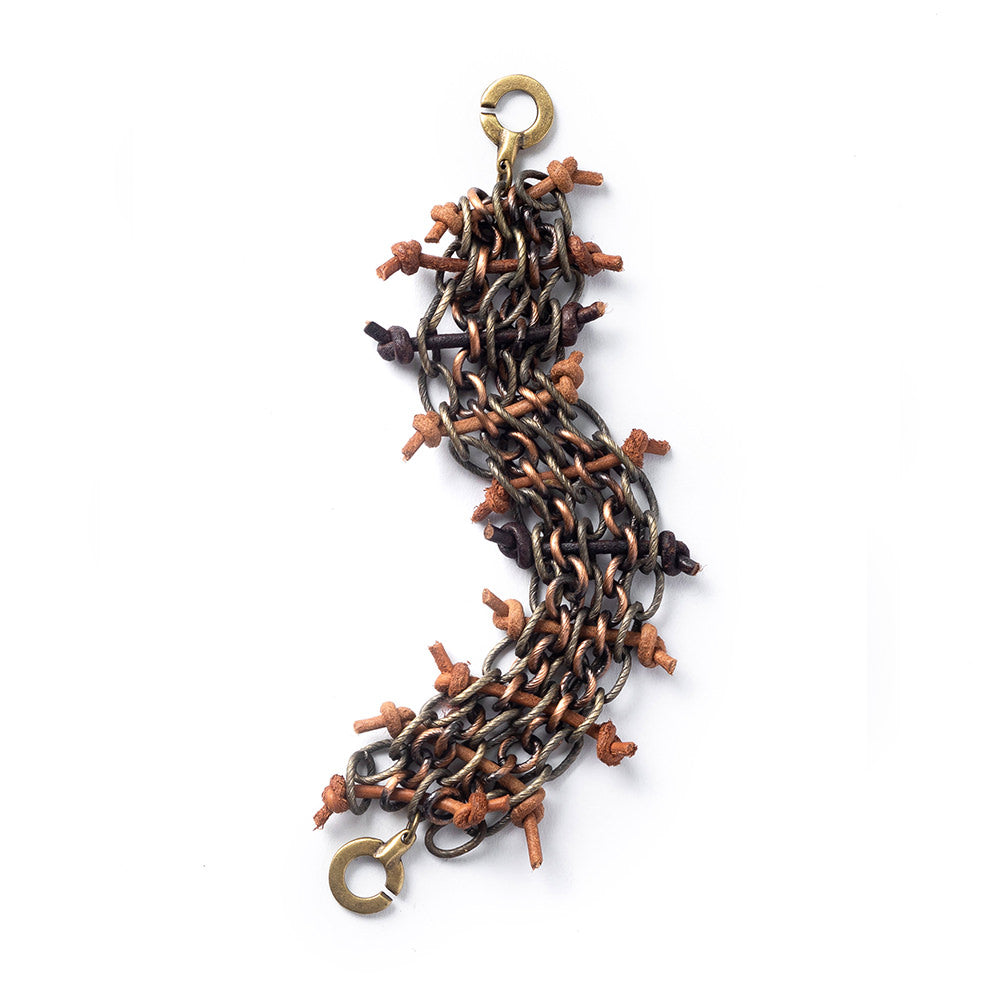 Narukvica od metalne legure s patinom, mesinga i kože.