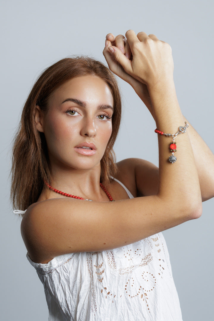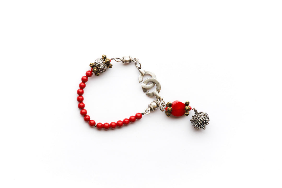 Narukvica od koralja i metalne legure s patinom i mesinga.
