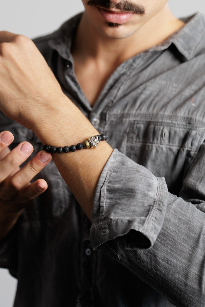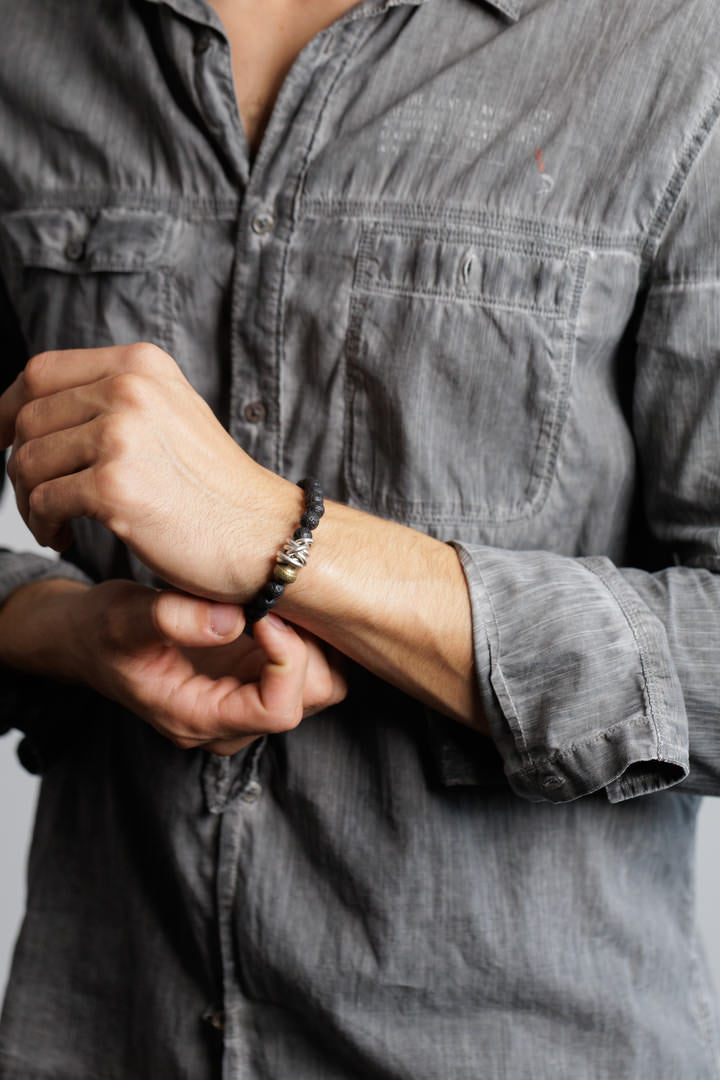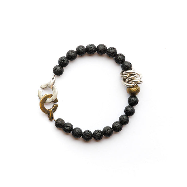 Narukvica od vulkanskog kamena s elementima metalne legure s patinom.