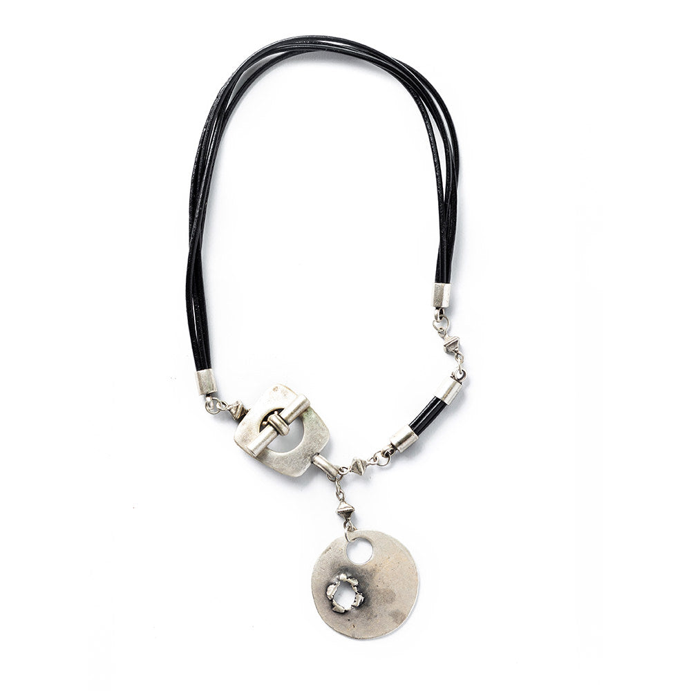 Crna kožna ogrlica s elementima metalne legure s patinom.