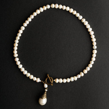 Ogrlica od riječnih bisera s elementima metalne legure s patinom i mesinga.