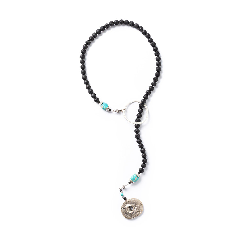 Ogrlica od vulkanskog kamena, detaljima poludragog kamena tirkiza te metalne legure s patinom.