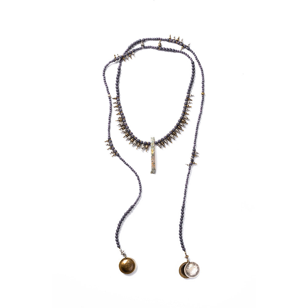 Ogrlica od vulkanskog kamena s elementima metalne legure s patinom i mesinga.